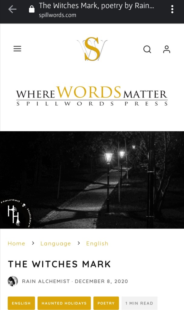 One of my horror fictional poetry “the Witches’ mark ” got published by spill words press under the special Haunted holiday series.